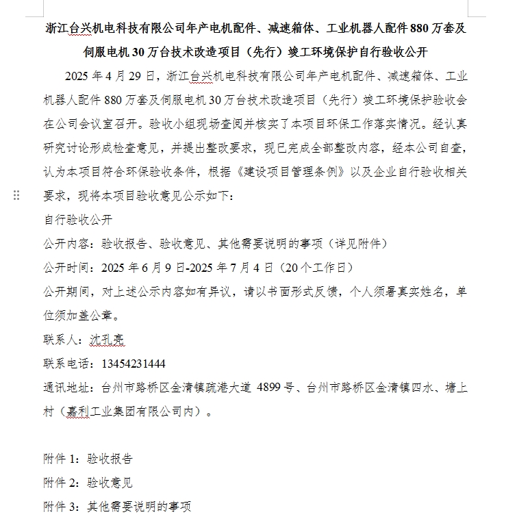 浙江臺(tái)興機(jī)電科技有限公司年產(chǎn)電機(jī)配件、減速箱體、工業(yè)機(jī)器人配件880萬套及伺服電機(jī)30萬臺(tái)技術(shù)改造項(xiàng)目(先行)竣工環(huán)境保護(hù)自行驗(yàn)收公開