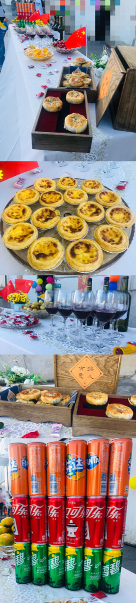 歌曲唱完之后,燒烤區(qū)也烤出了幾大盆碩果:小黃魚、秋刀魚、生蠔、對蝦、臘腸、羊肉串、骨肉相連、香菇、金針菇、小白菜、玉米、年糕、韭菜、茄子、土豆、饅頭、面筋等,大伙們都禮貌、謙虛地拿著各自喜歡的美食,品嘗起來,心里樂開了花。夜幕慢慢降臨,食堂里的主廚們也出爐了各自的拿手好菜,分發(fā)到每一桌。有江浙菜、有湘菜、有川菜,還有粵菜。滿滿的一桌菜,滿滿的一桌人,家人們在觥籌交錯之間,在舉國歡慶之時,一起暢談甜蜜的過去,幸福的當下,以及美好的明天?;顒映掷m(xù)到晚上8點,眾人才在依依不舍中互道離別。