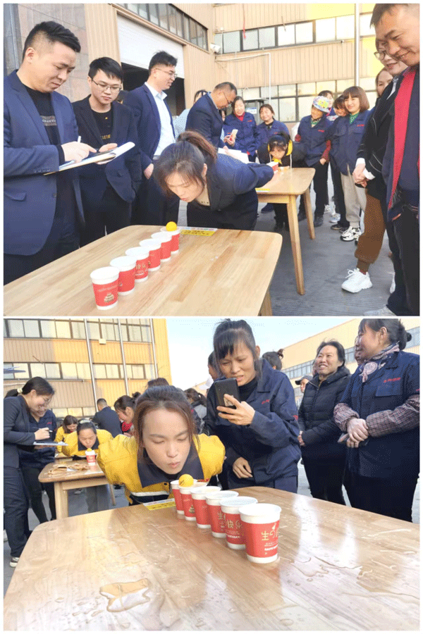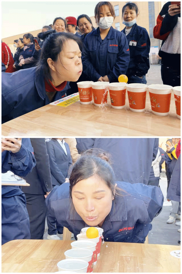 第一個(gè)游戲——“魚躍龍門”,共18名參賽選手,分3組,每組6人,每人面前有6個(gè)裝滿水的水杯,第1個(gè)水杯里放置乒乓球1枚,參賽者要用嘴巴吹氣,將乒乓球從第1個(gè)杯子吹到第6個(gè)杯子,并且要一個(gè)接一個(gè)地吹至下一個(gè)杯子內(nèi),直到吹入最后一個(gè)杯子,最后計(jì)算總成績,以用時(shí)最少的為勝。裁判長發(fā)令槍聲一響,所有人員都嚴(yán)格按照規(guī)則,氣運(yùn)丹田,卯足干勁,細(xì)心地、嚴(yán)謹(jǐn)?shù)?、精?zhǔn)地吹動(dòng)乒乓球。游戲中,有不滿20歲的小姑娘,也有年近退休的老大姐,大家都積極踴躍地參與。有的選手費(fèi)了九牛二虎之力將乒乓球吹到第五個(gè)水杯時(shí),卻不慎將球吹出了杯子,結(jié)果按照規(guī)則,必須重新開始。她們有懊惱跺腳的,也有開心鼓掌的,旁邊的觀眾也是群情高昂,吶喊聲、加油聲、歡笑聲不絕于耳,一開始就將整個(gè)活動(dòng)推向了高潮。