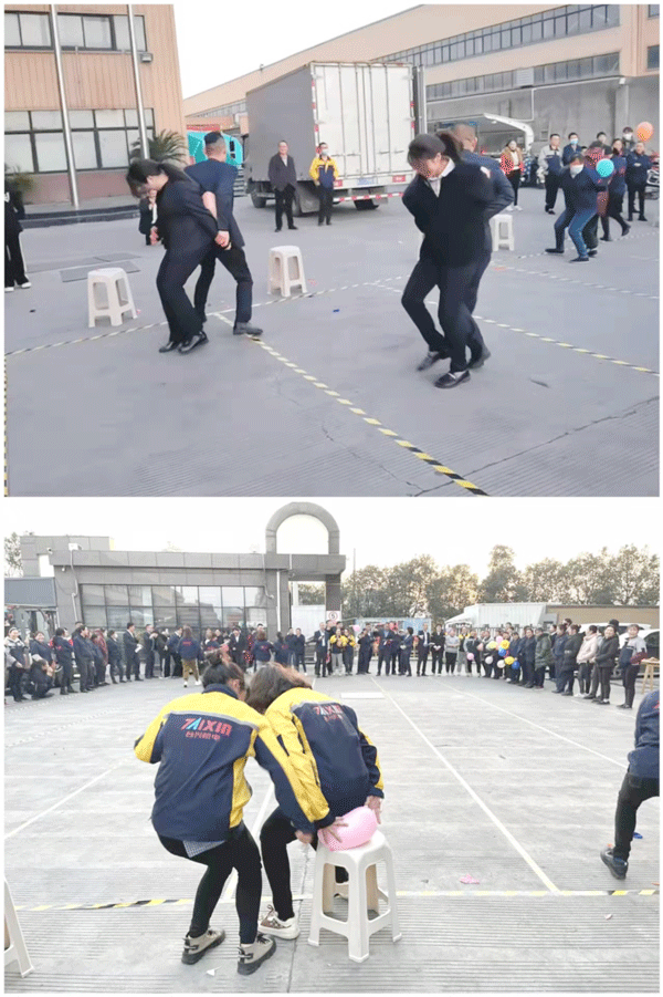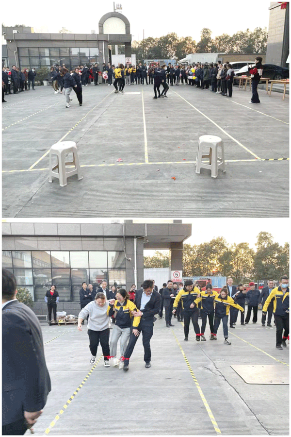 第二個(gè)游戲——“三人四足”,共60名參賽選手,3人組隊(duì),每隊(duì)站成一排,中間選手的左右腳與兩邊選手的右左腳用綁帶綁在一起(踝關(guān)節(jié)處),每隊(duì)選手在自己的跑道上集體前進(jìn),往返一趟,最后計(jì)算出所有參賽成績。60名選手,分別來自新廠、老廠、第二事業(yè)部的各個(gè)部門,女職工們還特邀“男伴”助陣?;顒?dòng)中,選手們精心準(zhǔn)備,從系綁帶,到排練、到找節(jié)奏,好不熱鬧。當(dāng)裁判長發(fā)令槍響起后,各隊(duì)選手邁著鏗鏘的步伐,在各自的節(jié)奏口令里,緊張有序地前行。有快速通過的,有慢而整齊的,也有不慎摔倒的,旁邊還有被現(xiàn)場(chǎng)氛圍感染的觀眾們。